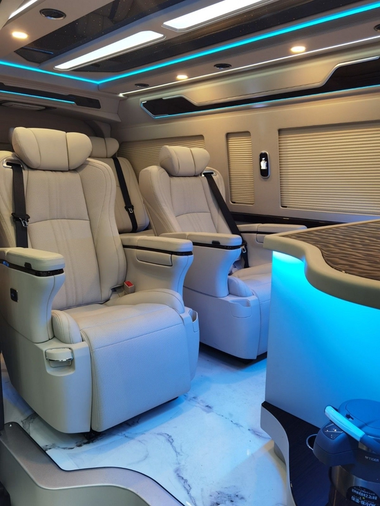 这台海狮整车升级了加强型的隔音隔热处理,车内带空气净化系统,无线充电系统。在进门侧加装了氧化铝脚踏带迎宾灯的,整车都是采用纳帕级皮质进行包覆的,侧壁红木装饰,手动百褶窗帘,后舱暖风系统,最后说说棚顶灯光,这个有智能触摸控制系统。灯光超级棒。