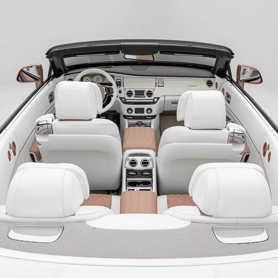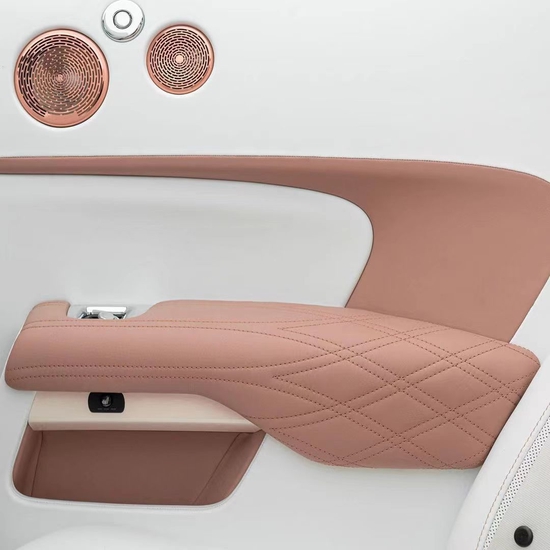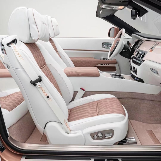 打开车门,迈莎锐MANSORY版本劳斯莱斯曜影选用了豆沙粉色与白色交织内饰,给人感觉雅致、清新,选材与工艺方面,迈莎锐MANSORY为座椅以及车内其他软装位置都选用了优质小牛皮,皮质鲜亮、细腻,坐垫及靠背上的菱形缝线,在增加美观度的同时,也让舒适感明显提升。