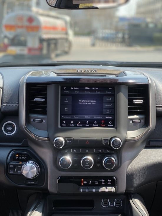 道奇公羊内部设计上还是延续了美式那种比较粗犷的风格,规整的中控台设计看上去比较死板,但丰富的配置会让你不由得为其称赞,中控台的设计简洁硬派,符合公羊的气质,仪表盘底边有花纹,则更加凸显了这款车的文雅性,软性材质的仪表台设计,摸上去手感非常舒服,并无些许生硬之处。