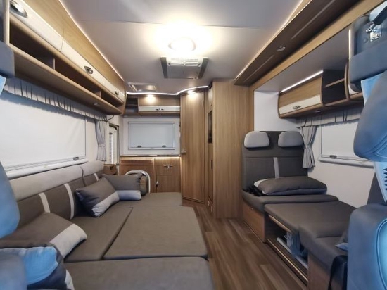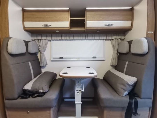 大量的浅色木纹家具,搭配米色的沙发座椅,整车格调温馨自在。和常见的依维柯C型房车不同,在内部布局方面大胆创新,前部车厢左右两侧各布置沙发座椅,并且都有着升降桌。