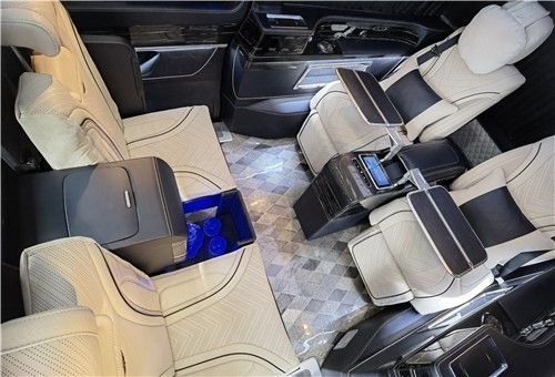 这款奔驰V260的贵宾舱采用的是两两对坐的商务洽谈格局设计,在大尺寸的液晶电视下方,奔驰V260配置了两个可折叠的秘书座椅,可一键电动展开。在两张秘书座椅的中间,是一个小型车内吧台,内置胶囊式咖啡机和一个折叠小桌台,最大限度的利用车内空间,折叠小桌台也可以给车内的商务人士提供一个处理文件以及与客户洽谈的平台。