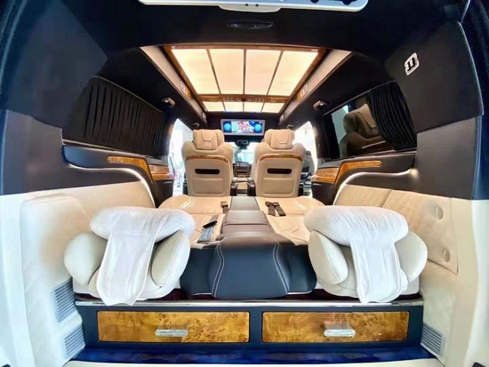 奔驰VS680改装整车加装了登车踏板、全车镀铬套件、LED迎宾踏板、LED灯饰及油漆同色,使整车更加尊贵霸气。竹苞松茂的时尚窗帘,8偏向电动调治按摩航空座椅,座椅阁下的文娱节制中隔屏,车内电器可任意一键操纵,可开启式全景天窗,在浩大的夜景中,共同“满天星”格调,好像在豪华的宫殿。