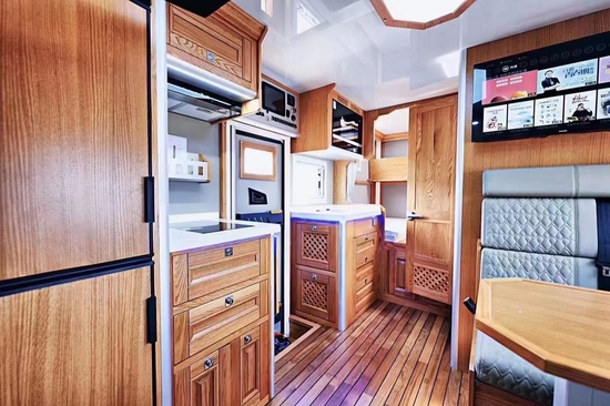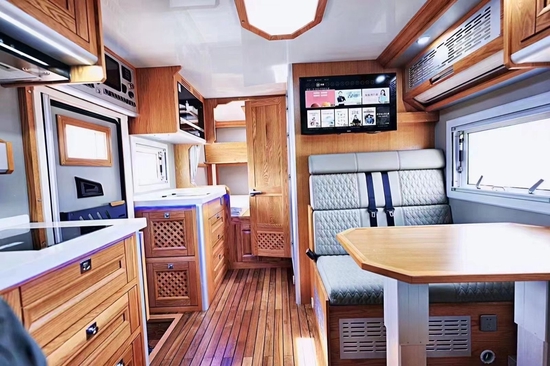 采用了进口红橡木制作的环保房车复古家具、拉丝铝板、柚木地板,是一个综合性的汽车生活区,总是透露着大气、沉稳、干练的中式家居风格,这也完全符合我国人民的生活要求。在车头的左侧,四个商务车座椅、客厅一个气动升降餐桌、客厅顶部悬挂的储物柜,三菱重工单冷变频空调,和两个复古内饰设计的通风窗。另外,客厅座椅、餐桌可以拼接成1900*1000mm的双人床。其实三菱单冷的变频空调,制冷的速度还是非常快的,在三伏天的车里也不觉得憋闷的。在冬季使用的时候,房车配备特鲁码燃油加热水加热一体机,供朋友们来使用。在后客厅和卫生间交界处挂着一台液晶电视,房车内标配连接日本雅马哈八扬声器音响系统,结合小米盒子,可以随心所欲地玩游戏或者看电影。