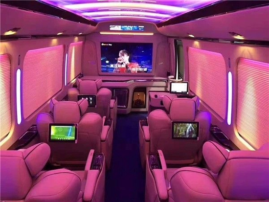 丰田考斯特改装商务车改装商务车尤其注重实用性的设置,高档的办公桌,双人汇报席,固定秘书席位。最突出的特点是我们对于车厢内冰箱和酒柜装饰,这些装置与司机驾驶席后的显示屏隔断,将车厢与驾驶席隔开,我们可以在隔断的中间增加电动门,方便来回的交流和沟通。