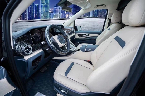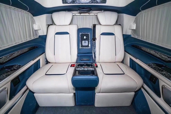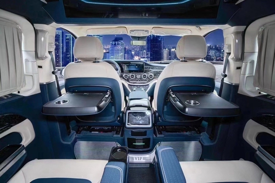 V250乘客舱前排首长级多功用按摩座椅带脚托,规划了滑轨,可自由电动移动和缩短,适应多种身高、体型的乘客,多种坐姿任君挑选,将舒适惬意延伸到车内每个旮旯。娱乐影音装备齐全,吸顶高清液晶电视,需求时可以往下翻,按钮一按,最新热点、时髦资讯随时把握。