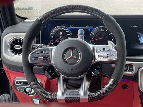 平行进口的G63可以单选弹射模式、22寸熏黑轮、碳纤维内饰、碳纤维方向盘、独家内饰包、前杠、暗夜包、红色内饰等配置