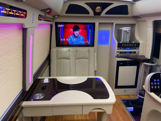 丰田考斯特12座改装商务车,除了座椅的改装以外,车内隔断的增加也是别有一番风味的,隔断的增加,将驾驶席和乘客席分开而设,同时我们可以在隔断上增加一些精美的装置,电子时钟,或者显示屏,方便有使用。隔断的效果最主要还是分离了司机和乘客,既能够给司机一个安静的驾驶环境,同样也为乘驾人员提供了更加静谧的乘车空间。