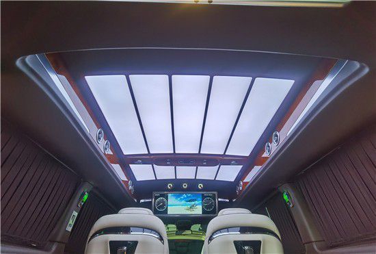 后排三座座椅更像是一个多人沙发了,座椅可以通过触摸屏控制直接展开成床,无论是短时间的休息还是孩童的玩耍都是不可多得的场所。车顶灯的设计也和车内的风格设计如出一辙,现代简约风格,由条灯和环形灯带营造出的车内氛围还是相当不错的。