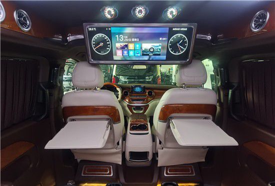 2022款进口奔驰V250商务车棕色是一种低沉具有浑厚力量感的柔和暗色,它营造出整车内饰的寂静气氛,同时使用具有闪光感的金丝木穿插在暗色内饰中,使奔驰V250改装活跃了气氛,增添了些许生动,同时宫格造型顶灯的加入,使得整个黑夜韵味涌现明朗与安详。