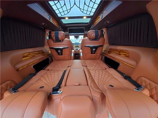 进口奔驰V250迈巴赫VS680的第二排座椅采用了奔驰迈巴赫授权专用座椅,支持28项电动调节,此款航空座椅(带360度旋转、通风加热气动按摩、160度电动后仰)还配备了两个迈巴赫头枕 整车橙色与梨花木相结合时尚感爆棚 豪华航空座椅触摸式控制方便快捷 豪华氛围灯点缀 柏林之声音响环绕