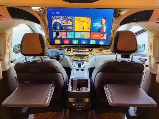 商务车后舱一排私人定制座椅,柔软宽大,极具细腻触感,带多项电动调节功能,可调节两向头枕和舒适腿托,带豪华按摩功能,尽享尊贵体验,还可以前后滑动及180度旋转功能,车壁处置隐藏工作桌板,外出办公也是如此方便舒适。