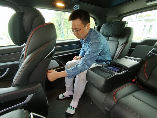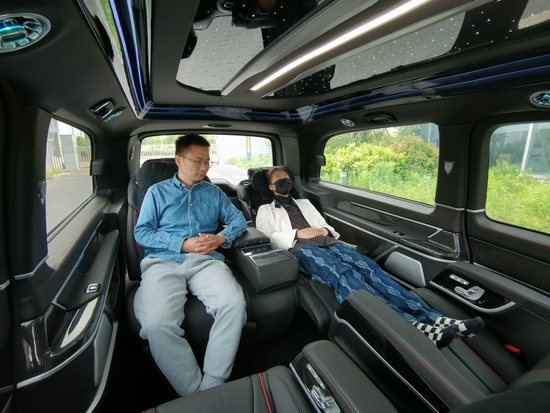 进口罗伦士天舟三排座椅:三排座椅4+6布局,左右舒适兼顾,自主调节,三排座椅14项电动调节(坐垫前后联动,靠背独立调节,头枕独立升降,腿拖独立升降),通风,加热;左右侧墙无线充电