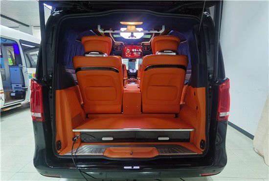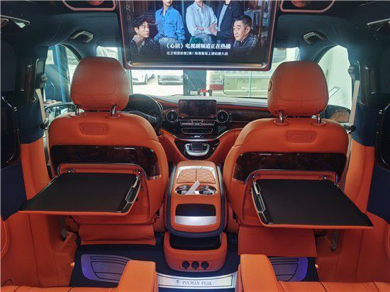 奔驰V260改装骑士一号商务车内采用了了超清三星曲屏电视,搭配影院级音响系统17路扬声器,商务小桌板用于置物办公,豪华编织地板,顶部环形氛围灯7色,高档钟表三联表(并且此款车型加装了JBL音响)