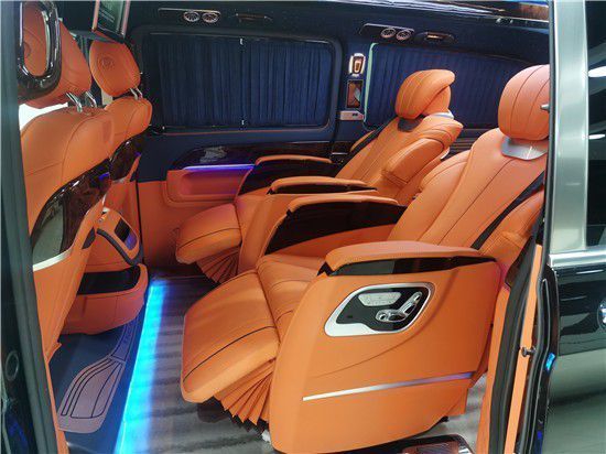 让您花低的价钱来享受一台最高端的奔驰迈巴赫也绝对有面子 V260改装后还配有车厢内的灯光设备,按下按钮,车厢内顿时充满了黄色的炫彩灯光气氛以及漫天星晚上给人看星星的感觉。中控安装了14.1寸显示屏到时影响更加清晰可见还可以休闲娱乐,以及正副驾驶后面的商务桌板给了商务以休闲的功能,后面两个娱乐显示屏可让乘客更加休闲娱乐,商务人士可在会议过后利用车厢的灯光设备等,顿时让氛围轻松起来,可商务可休闲。吸顶电视设计使得车厢给人娱乐休闲的感觉,满天星顶会让您夜间行车抬头仰望,也让人有浪漫的星空臆想念头。倘若把周围的窗帘都拉开,闭上眼深呼吸,感觉与周围的环境很是融合,给人以心旷神怡的完美感