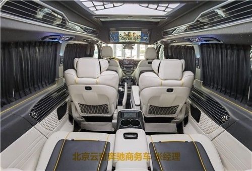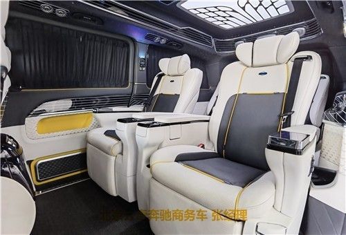 奔驰V260L版以下是贵宾舱二个总裁座椅,这二个座椅具有记忆功能,何为记忆功能呢?就是一键展开及一键收回,这个座椅是根据人体工程学设计而成,能一键式找到您身体最舒适的角度。在总裁座椅双侧有两个隐藏式桌板。总裁座椅中间有个热感电子触摸屏幕可控制后舱设备,屏幕下方有个“语音控制系统”也可控制整个贵宾舱的设备。