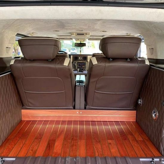 悍马车内变成了四座布局,中间放置了一个小隔断吧台,地板采用游艇级柚木地板,车顶是九宫格顶灯和星空顶,颜色变换多,这些配置的搭配和豪华商务车内饰相似,坐在越野悍马上就能享受到豪华商务车的体验。
