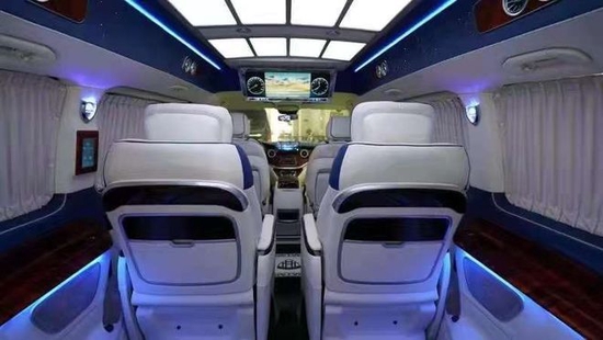 升级后奔驰威霆改装商务车带有电动窗帘,娱乐系统电视机,以及顶灯的造型都参照的是海洋霸主大白鲨的设计。周边的出风口都是分散式出风,不会直接对人吹。而且奔驰威霆改装商务车的整车每一个套件每一个板块都是开模制作,精细化工艺,每个层面都做到了最完美的衔接。