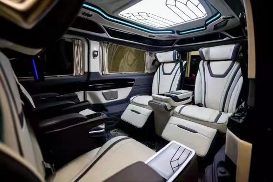 奔驰V250前后排隔断的处理方式,更好的为大家提供隐秘性并且大大提升了后排的娱乐体验。隔断采用的是32寸曲面屏电视后排的乘客可以通过隔断下方的中央操控面板控制的电视升降和车内灯光的调节。