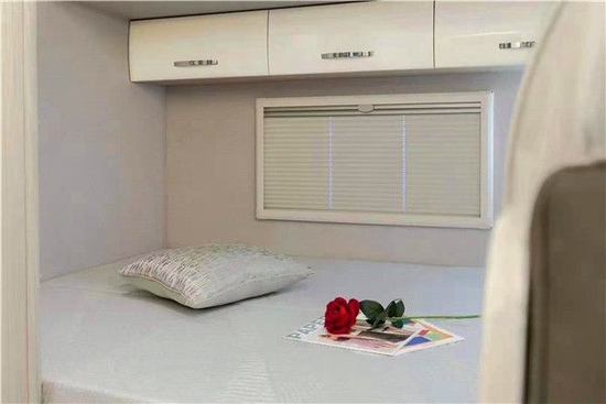 车厢尾部拓展打开后则是一张尾部双人床,尺寸约为1950*1360mm,与其它尾部拓展双人床一样,拓展后的双人床有一定内外长度差。除此之外,尾部床提供了氛围灯和储物格,提升了这里的实用性。