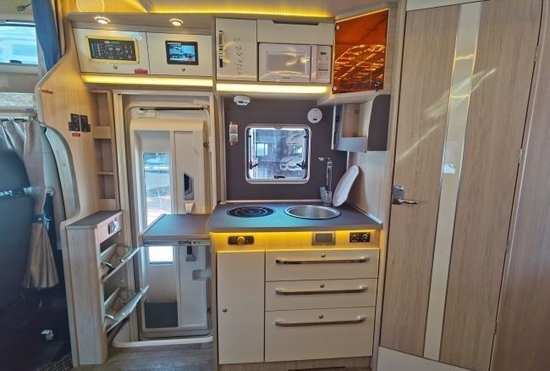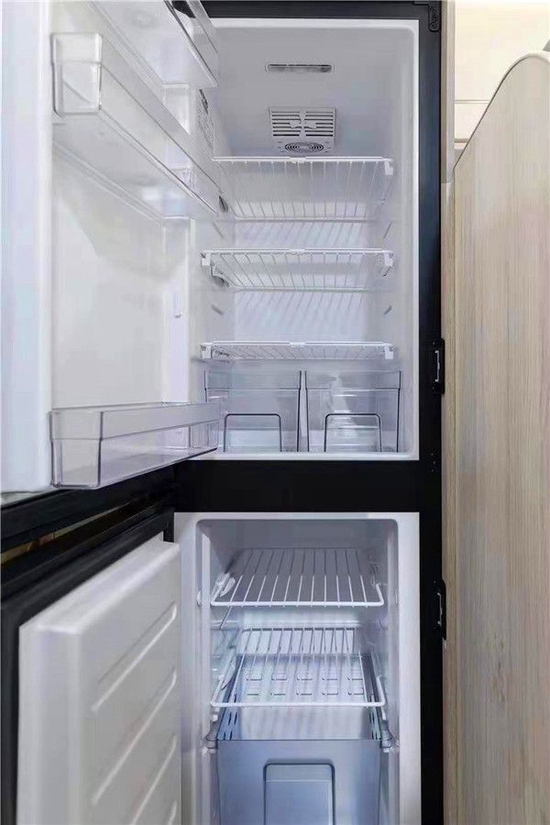 厨房区配备电磁炉、带盖板的洗菜池、油烟很及微波炉,橱柜及洗衣机,透明酒柜,商务风尽显,赛特福德152L车载冰箱。依维柯尊领ST采用德进口REICH水而管件系统,带前置看滤器和美国进口赛福乐水泵。