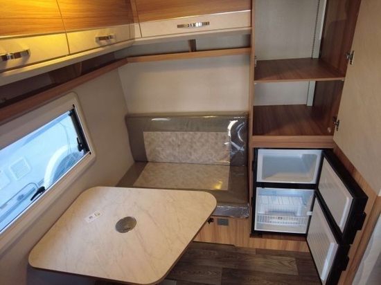 一进门,车辆右手便是厨房区域。车辆标配不锈钢的洗菜池,车辆标配85L的房车专用双开门冰箱,220V供电的嵌入式电磁炉,旅行生活更加轻松惬意。