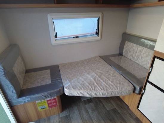 最后,是车辆前部的主卧区域。采用横置设计,装有高弹海绵环保床垫,尺寸为2200毫米x1400毫米,可睡两人。