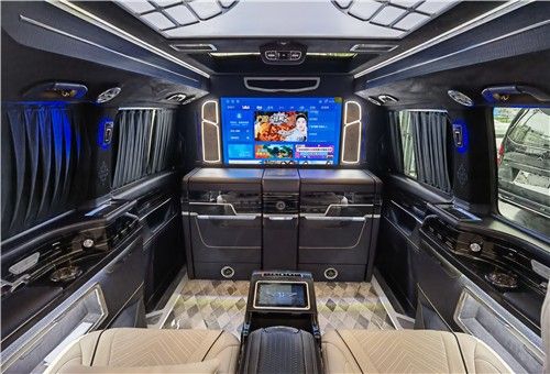 这款奔驰V260的贵宾舱采用的是两两对坐的商务洽谈格局设计,在大尺寸的液晶电视下方,奔驰V260配置了两个可折叠的秘书座椅,可一键电动展开。在两张秘书座椅的中间,是一个小型车内吧台,内置胶囊式咖啡机和一个折叠小桌台,最大限度的利用车内空间,折叠小桌台也可以给车内的商务人士提供一个处理文件以及与客户洽谈的平台。