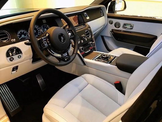 劳斯莱斯库里南的内饰遵循了劳斯莱斯一贯的设计风格,造型经典复古但不失科技感,大量实木饰板的采用,提升了内饰的档次感。而大面积真皮包裹的设计,则成功的营造出奢华舒适的内饰氛围。仪表盘的设计较为古朴,内部指针清晰可见,外圈还配备有劳斯莱斯珠宝般的装饰环。方向盘沿用了经典的三辐式造型,但是整体设计更加小巧、厚实,并且内部包裹有可加热的柔软材质。
