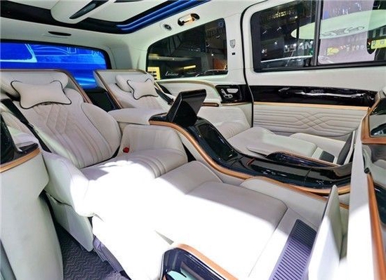 奔驰湾流VS600MX 湾流整个后舱私密性超足,整车超级隔音处理,Lorinser定制抗疲劳降噪地毯,驾驶仓与乘坐仓用豪华隔断隔开实现了汽车后舱的终极形态,真正成为“时代级产品”。