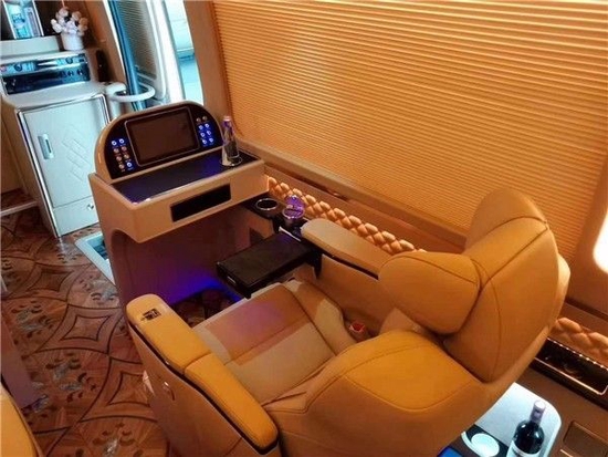 这款中巴车最具吸引的地方就是改装完成后的奢华内饰,独具色彩。超豪华独立航空座椅,其功能多样化,加热、通风、按摩、脚托、扶手应有尽有,进口航空地毯,百褶窗帘,空壳顶灯,32寸车载专用显示器,冰箱。用贴心与多元化的设计元素,让旅程和商务接待始终承载便捷与欢乐。