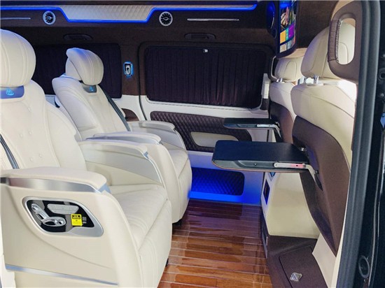 内饰通过改装实现了满足商务接待、洽谈、出游等各种出行需求。全车真皮包覆质感十足。然后它的第二排的座椅也达到了飞机头等舱的标准,手感细腻的进口纯手工真皮包裹,配有精致缜密的缝线,细节之处随处可见。不仅看上去更有档次感,而且在您坐上去之后就能感觉到它完美的衬托感!还具有多向电动调节等功能!它不仅可以让乘客更好的休息,也还可以和后排的人一起下棋或者打麻将,因为这个座椅可以旋转到后方,这样就可以轻松的娱乐了,座椅具备了通风和加热、按摩、记忆功能,整车配置强大,说不出一个不好的理由。