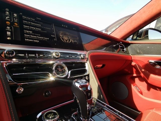 22款宾利飞驰三面翻转中控面板,当按下发动机起动按钮时,仪表板中央的饰面无声地滑动翻转,可呈现出一个12.3英寸的触摸屏,该屏幕上配备三个可自定义设置的数字界面。内饰用料顶级,手能触及的地方非真皮即实木,选材不计成本。中控台大面积的胡桃木饰板仿佛玉石一般润泽,让人非常舒心。