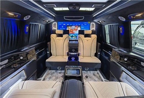 这款奔驰V260的贵宾舱采用的是两两对坐的商务洽谈格局设计,在大尺寸的液晶电视下方,奔驰V260配置了两个可折叠的秘书座椅,可一键电动展开。在两张秘书座椅的中间,是一个小型车内吧台,内置胶囊式咖啡机和一个折叠小桌台,最大限度的利用车内空间,折叠小桌台也可以给车内的商务人士提供一个处理文件以及与客户洽谈的平台。