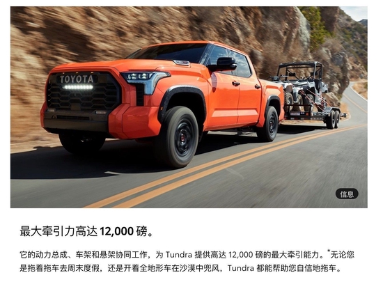 2022新款改款丰田坦途3.5TT配置:18寸越野合金车轮,基础牵引包挡风玻璃除冰器和后窗除雾器,双光束LED前照灯,倾斜伸缩式方向盘,起动和停止发动机系统,单区自动空调,带启动按钮的智能钥匙,双向电动驾驶员和乘客腰撑支持,坡道起动辅助控制,双区自动空调,前排座椅加热,TRD皮革包裹换档旋钮,TRD加热型方向盘,带RCTA的盲点监测器,停车辅助+后桥差速锁,陡坡缓降,蠕行模式,多功能地形选择,电加热镜子TRD格栅越野避震器后桥差速锁。