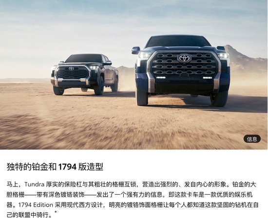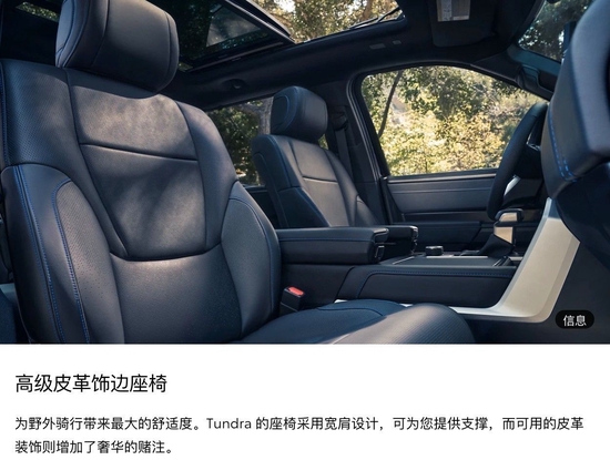 2022款丰田坦途新车的设计刷新了我对日系车的印象,配全液晶仪表+大尺寸的悬浮式中控大屏,科技感十足;而且还有运动感十足的四幅式方向盘、推进式换挡杆以及活力四射的双色内饰搭配,很难想象这是一辆硬派越野皮卡。另外,新车将会配备TRD Pro座椅刺绣。