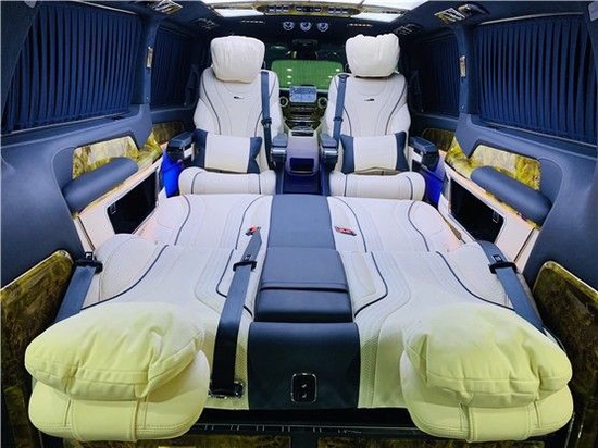 奔驰圣母峰七座商务车第三排座椅不只可以坐人,在旅途劳累的时候也可以电动成床进行休息。小郭偷偷告诉大家哈,二三排座椅内都填充低弹性聚氨酯,超越一般飞机头等舱座椅的乘坐体验。