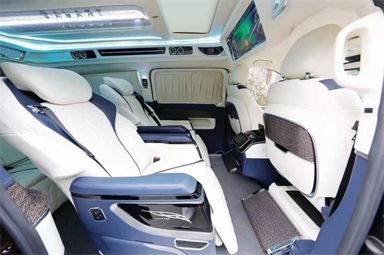 2022款奔驰V250改装商务车第二排头等舱座椅为带电动式、加温、推拿、自然通风功能的航空公司级长官席,可顺着上空上导轨进行一键气动式前后左右拖动,有关这类智能化系统的乘座感受,是原装车系愚钝的手动式拖动方法所自愧不如的,车里的车内氛围灯打开后,奔驰V260内舱越来越灵便变化多端,氛围还可以依据餐厅灯色调转换而转变,关键的乘座坐椅配备的单独的推拿功能,自然通风加温,一体腿托,功能丰富,乘座温暖,是外事接待出行的代步出行优品。