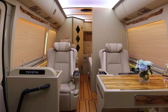 (新款丰田考斯特6座7座8座9座房车价格) 华通丰业汽车2022款丰田考斯特房车相对于原版考斯特房车来说,最大的提升是用料提升,华通丰业汽车丰田考斯特房车的用料相比过去有很大提高,华通丰业例如车厢内两侧大部分用仿实木材料覆盖,原先光秃秃的原始车窗不见了,华通丰业汽车特别是车顶围绕顶置空调布置的装饰灯带很漂亮,档次感明显提升。