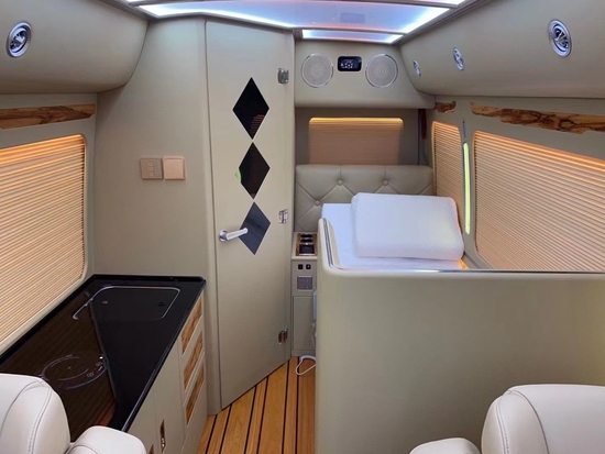 (2022款丰田考斯特6座7座8座9座房车多少钱) 华通丰业汽车丰田考斯特房车卫浴间在车身中部,一体成型,采用软帘门设计。华通丰业汽车标配便携式座便器,也可以选装固定式电动座便器。旁边是一体式洗脸台,抽拉式水龙头既可以放置在台盆上也可以作为淋浴喷头使用。除此以外还配备了梳妆镜、毛巾架和换气扇。