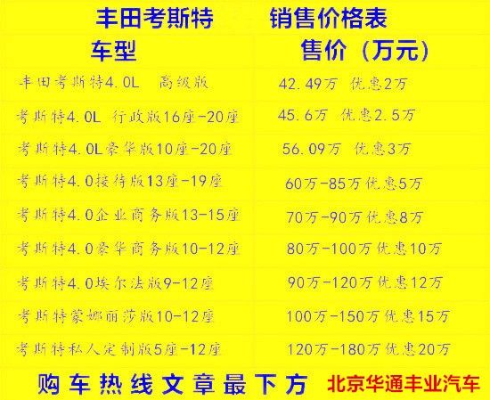 (丰田考斯特6座7座8座9座房车)华通丰业目前销售丰田考斯特6座、7座、8座、9座、10座、11座、12座、13座、15座、16座、17座、19座、20座、23座现车销售, 豪华内饰改装。考斯特长7.005米,宽2.04米,高2.774米。 全部现车(当日提车 手续全)丰田考斯特你们值得拥有。北京华通丰业实力大厂,值得信赖,欢迎来电详询!可安排专车免费接送服务!外地购车者可安排住宿!专业改装顾问为您服务!质量担保,价格低。质量高。随机减免5万至8万元起提供板车运输服务!