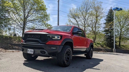 道奇RAM 1500 TRX整个的外观设计沉稳中透露出霸气,整体给人的气场非常的强烈。联系电话:13116175210华姐 (同号微信)整车黑白色的搭配,可谓是恰到好处,非常的酷炫霸气。前脸部分,新车装配了熏黑蜂窝状进气格栅,中间硕大的RAM内嵌其中,以此来表明新车的身份,而新车的机舱盖上方加入了高流量进气风口,相比福特F-150车型也更具硬派气息。