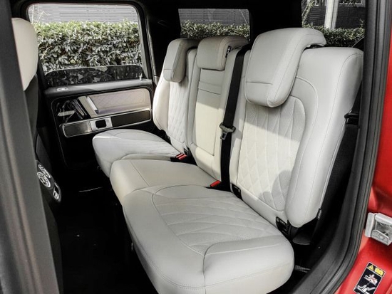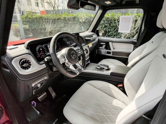 内饰配置:白色菱形格座椅,Nappa真皮性能方向盘,最高限速解除,碳纤维内饰。G制造内饰增强包(AMG独家Nappa菱形格座椅,nappa真皮仪表台,多功能前座椅带加热通风按摩,AMG头枕和脚垫,乘客徽章握柄)