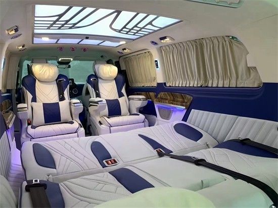 这款奔驰v260升级了整个乘客舱,内饰装饰,格局造型,灯光设计都是精心设计,整个后舱奢华至极。二排座椅更换成航空座椅,通风、加热、按摩、旋转等功能应有尽有。航空座椅内部材质为钢架结构及航空座椅棉,外部材质为纳帕真皮,乘坐舒适,功能齐全。改装航空座椅后会提升舒适度,座椅内部海绵更加富有弹力,外层真皮更加柔软,适合长时间乘坐,并且具备按摩、加热、通风、手机充电、电动腿托、电动靠背角度调节,等强大的航空座椅级功能。