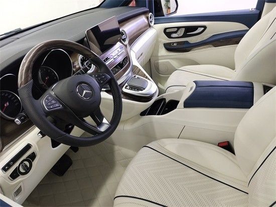 这款奔驰v260的驾驶舱做了整体的包覆,包括中控台,座椅、扶手箱、方向盘、驾驶舱车顶等。主色调为米色,搭配精美桃木装饰,座椅10向电动调节,还带有通风等功能。扶手箱从一般的储物盒变成专属的车载冰箱,冰镇饮料不在话下,这款奔驰V260在扶手箱的后面带有加热的杯托,前方带有无线充电和杯托,方便平时充电和放水杯使用。