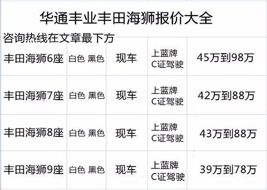 原装进口丰田海狮6座、丰田海狮7座、丰田海狮8座、丰田海狮9座丰田海狮10座版、华通丰业丰田海狮11座版、丰田海狮12座版、丰田海狮13座版,更有可上蓝牌照的丰田海狮6座、丰田海狮7座、丰田海狮8座、丰田海狮9座,华通丰业专业改装航空座椅,北京现车最低价格。感兴趣的朋友不妨关注一下。