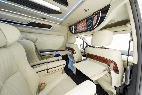专车专用的19寸吸顶液晶网络电视让您旅途当中不再无聊寂寞,纳帕真皮包覆的棚顶更加方便您打理,两侧的立柱彩灯时时变换散发迷人的色彩,司机方向盘和仪表盘桃木装饰更显高端。