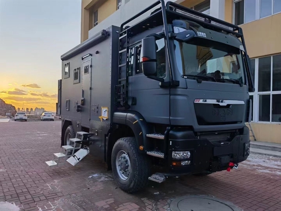 新重汽曼恩4×4重型越野房车基于重汽豪沃TX 4×4底盘打造,车身尺寸为5995×2550×3600(mm),轴距3600mm,整备质量12200kg,最大总质量13000kg,油箱容积为400L,可轻松续航1800公里;车身采用德国曼TGA柔性车架,箱体为热断桥硬化铝骨架六层加强保温结构,厚度为60mm,耐零下30度低温。越野专用方舱造型,三点悬浮设计,保证车厢稳定性的同时也防止意外变形,地板及家具异响,极大延长箱体使用寿命。底盘方面,前后悬挂采用前后专用板簧+液压筒式减震器的组合形式,其作用可过滤行驶途中的颠簸感也保证了舒适性;三把差速锁也让它对于任何路况都可从容不迫的通过,提升了户外越野的生存性。轮胎规格为425/65 R22.5。
