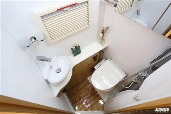 厨房区位于房车中门左侧,配置有小米智能电磁炉、松下微波炉、赛特福德双门150L冰箱、洗菜池+高端定制水龙头、进口卡洛西后舱冷暖风行车空调、厨台插座+厨台灯+卫浴灯开关和储物组合。整个厨房台面、玄关台面、会客厅的餐桌台面、卫生间的洗漱台面都是运用了大面积的玉石台面,增加了整车的品质和档次,也提高了他的这款车的奢华。这款车采用的是三菱重工1.5p(匹)家用变频空调,制冷制热又静音,它的除湿效果也是非常的好用,对于南方的老板们这个设计就非常的人性化了。