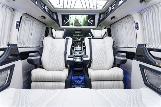 奔驰威霆商务车改装后的乘坐舱更加舒适,换上了高级商务航空座椅。该车采用七座不仅仅,在第二、三排格局合理舒适,第二排为航空级首长席座椅,带电动按摩、旋转、通风、加热等八项舒适性调节功能。第三排可以根据需要放平就是一张舒适的双人床。
