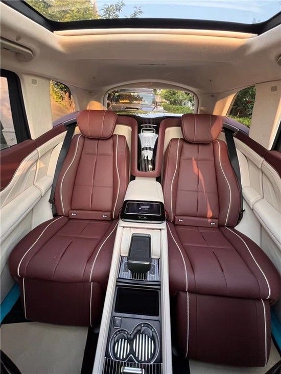 迈巴赫GLS600 (配置|询价)采用了四座布局,其中第二排独立座椅相比普通版GLS (配置|询价)更为靠后,同时还带有巨大的腿拖,而中央部分则是由控制台、储物空间和手机无线充电台等进行贯穿,并呈现出了类似于迈巴赫S级 (配置|询价)相同的头等舱设计。
